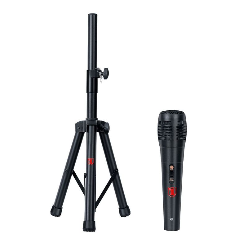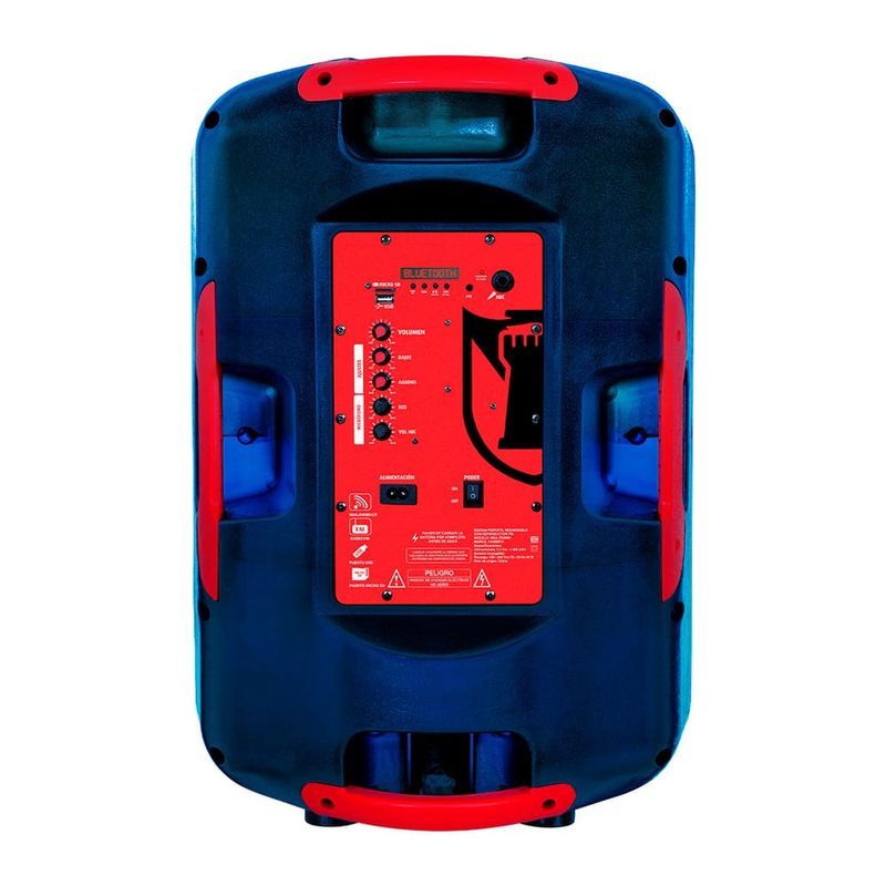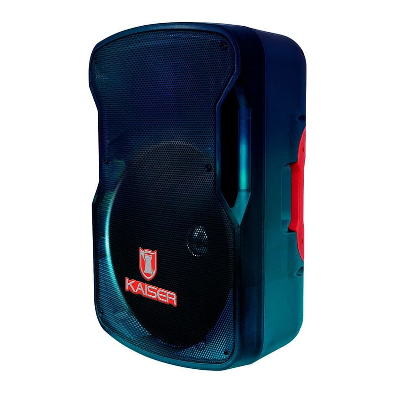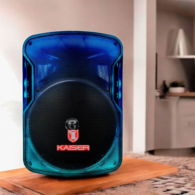 Bafle 15" profesional recargable , tecnología ksr-link 9.2 que permite enlazar otra bocina del mismo modelo, luz multicolor, potencia de audio 25,000w pmpo/ 40w rms, bluetooth con alcance de hasta 10 m, radio FM, led indicador de estatus de la batería,   , perillas independientes de volumen general y de graves, agudos, micrófono y eco ,funciones: prioridad de audio del micrófono, display y controles de reproducción, impedancia 3,6 ohm, entradas: 3,5 mm para dispositivos de audio,6,3 para micrófono, USB, micro sd, incluye :  tripié y micrófono alámbrico, cable para cargar la batería.