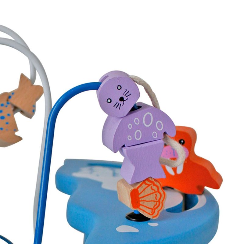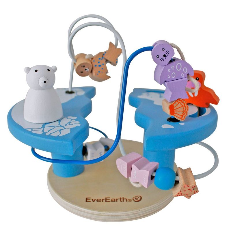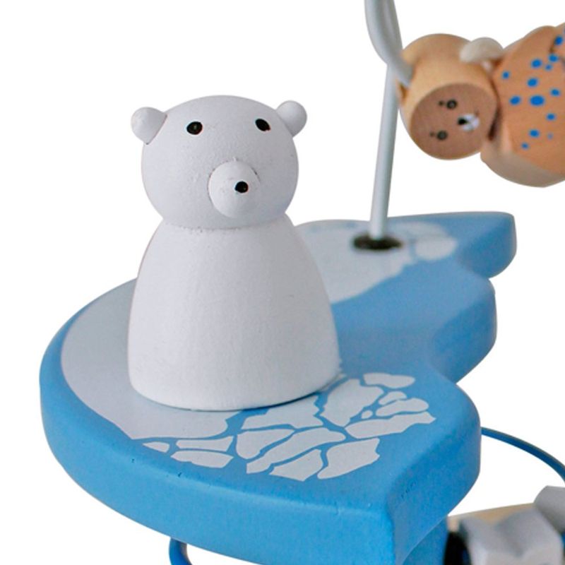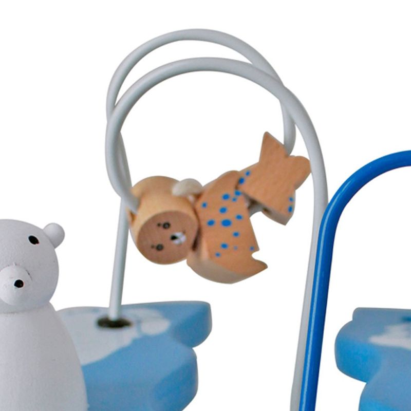Este es un juguete laberinto de cuentas con temática ártica diseñado especialmente para bebés y niños pequeños. Está fabricado principalmente en madera y cuenta con estructuras metálicas curvas por donde los niños pueden deslizar figuras de animales y cuentas de colores.