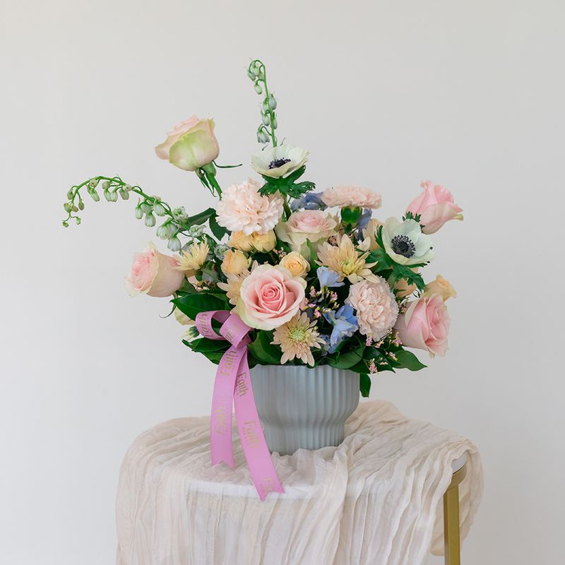 Arreglo en base celeste de ceramica, compuesto rosas y flores de complemento