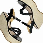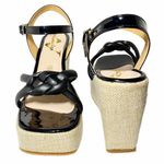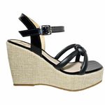 Sandalia casual de plataforma con punta cuadrada, capellada con 2 correas de media caña, formando un nudo pie de rey, cada correa de 1.2 cm de ancho, hebilla metalica con pasador de media luna, combinando 2 tipos de materiales, capellada en material p.u. sintético y el pasador con el hebillero y la plantilla en charol, suela forrada con fibra de yute, disponible en color negro, sandalia casual, perfecta para el día a día por la altura de la suela, permite un mejor adapte al pie.