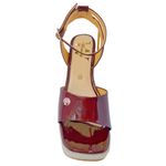 Sandalia casual de plataforma con punta cuadrada, capellada con diseño, estilizada con una gargantilla que da firmeza al pie, suela forrada con fibra de yute, suela antideslizante. Elaborada con materiales de origen 100% sintético. Disponible en charol perleado color vino.