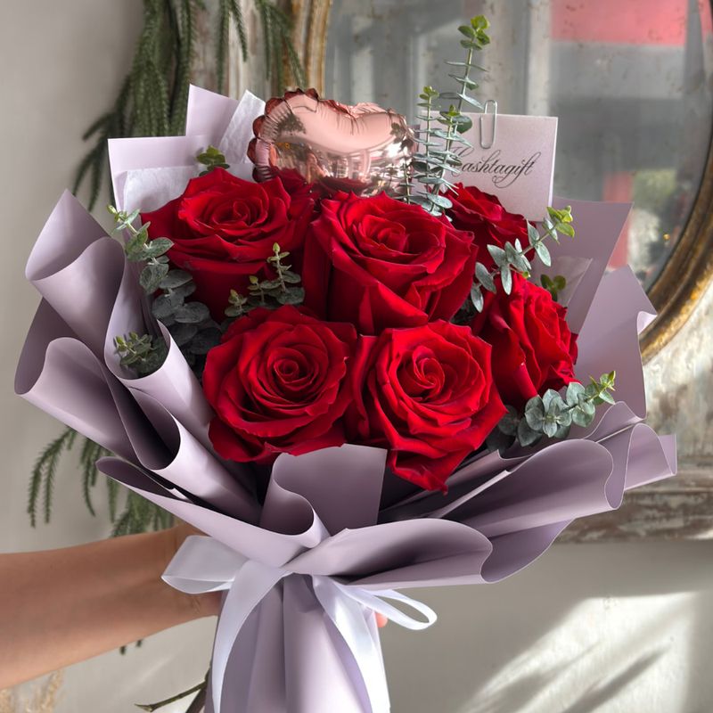 6 rosas rojas, eucalipto y globo de foil corazón pequeño