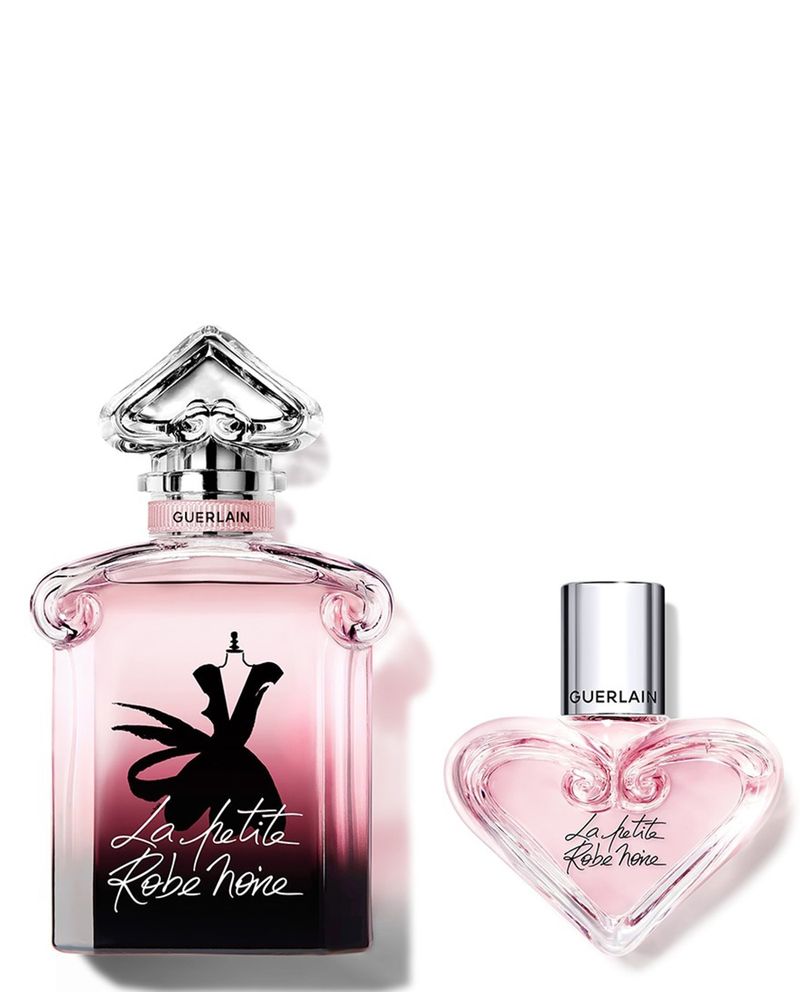 El estuche de regalo Eau de Parfum La Petite Robe Noire de Guerlain incluye un Eau de Parfum de 75 ml y un frasco de corazón de 20 ml. El Eau de Parfum presenta una estela floral afrutada, con notas de rosa, cereza negra, té negro y pachulí. El frasco de 20 ml es un diseño nómada y recargable, ideal para llevar en el bolso. El estuche cuenta con una decoración poética y elegante.
