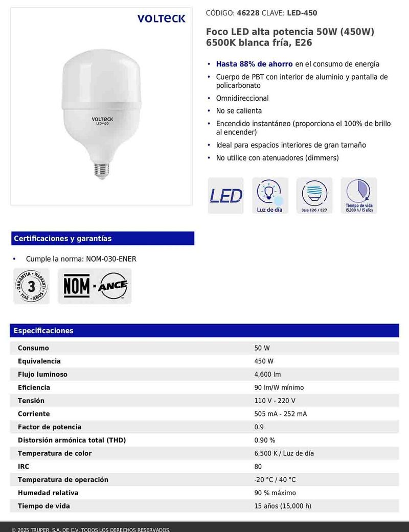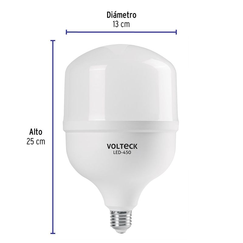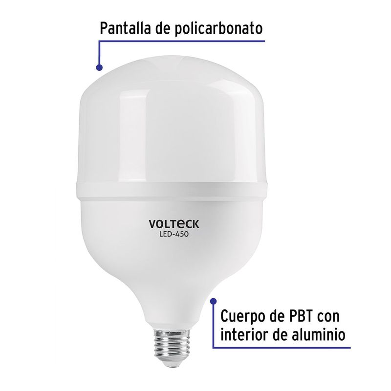 Este foco LED de 50W ofrece una iluminación potente equivalente a 450W, con un flujo luminoso de 4,600 lm y luz de día a 6,500 K. Su diseño integra un cuerpo de PBT con interior de aluminio y una pantalla de policarbonato que asegura mejor disipación térmica y operación en frío. Es ideal para espacios interiores amplios, proporcionando encendido instantáneo, menor consumo energético y distribución omnidireccional de la luz.