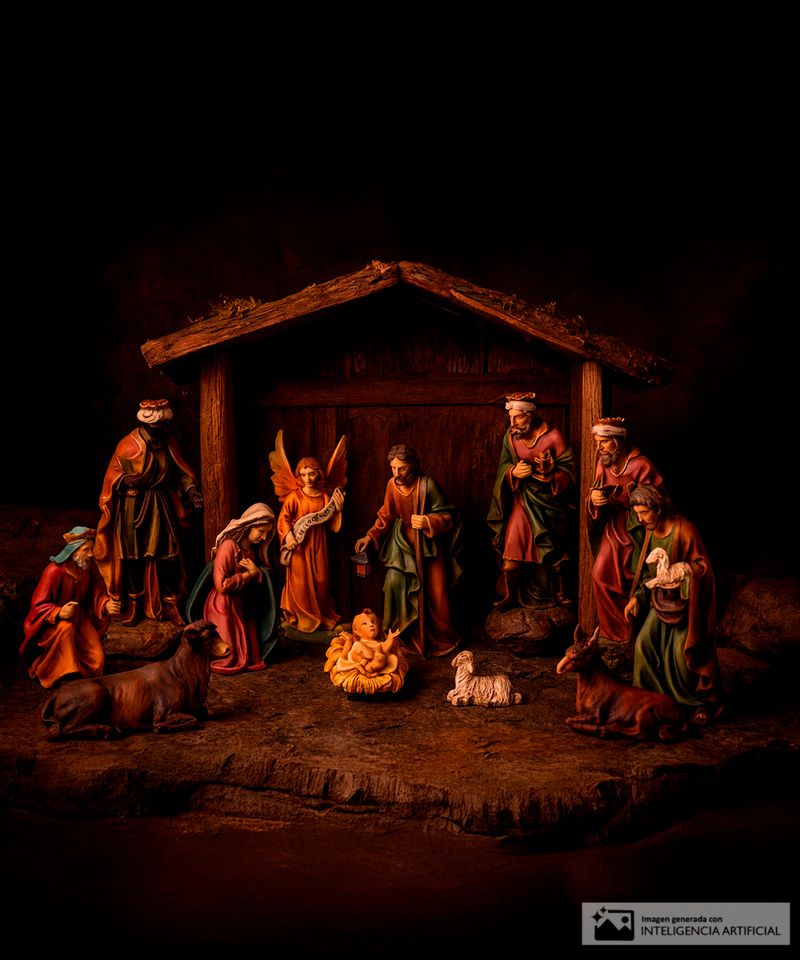Este juego de nacimiento de 11 piezas, con figuras de 30.5 cm cada una, incluye a María, José, el niño Jesús, los Reyes Magos, pastores, un ángel y animales. Es una representación tradicional y detallada del nacimiento de Jesús.