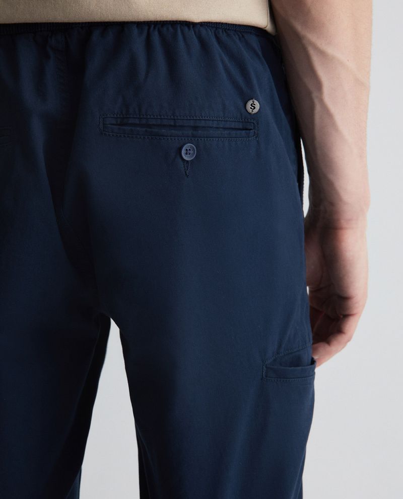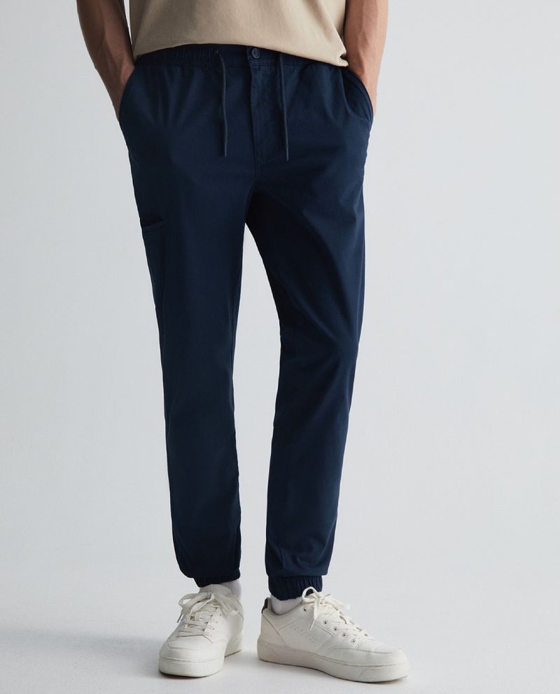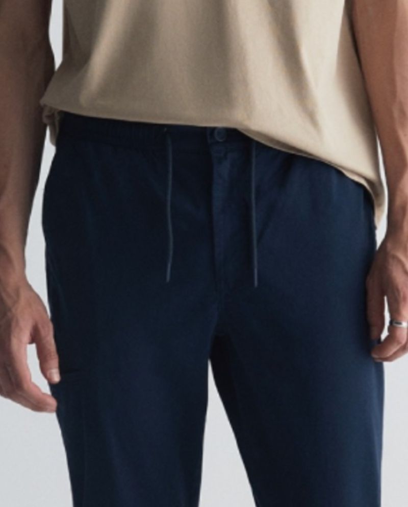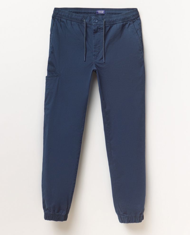 Pantalón casual marca Sfera, diseñado en color azul sólido con cintura elástica y cordón ajustable.