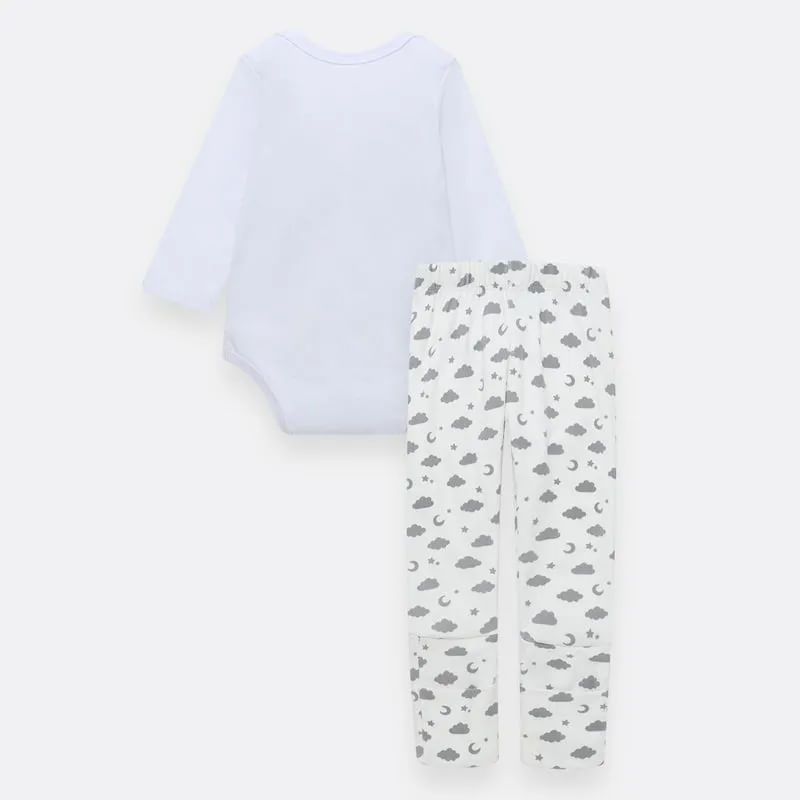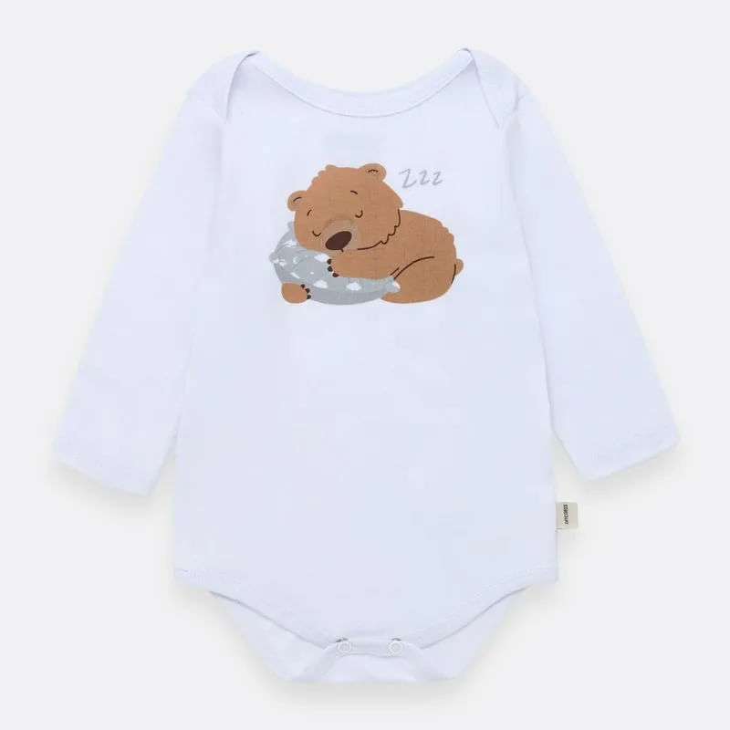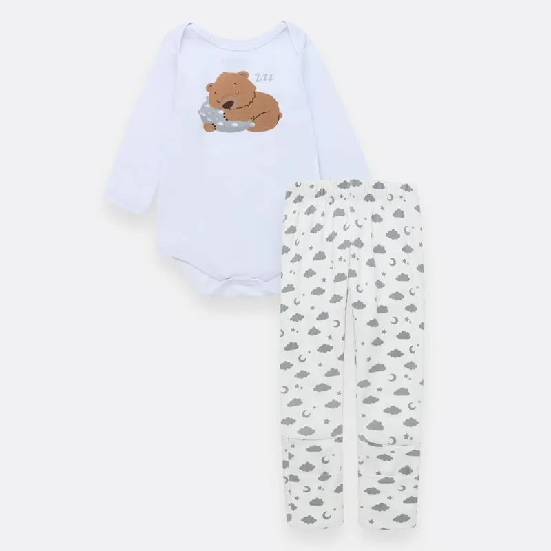 Esta adorable pijama para bebé niño es perfecta para brindar comodidad y calidez durante la hora de dormir. El conjunto incluye un body blanco de manga larga con un tierno estampado de un oso abrazando una mantita, ideal para transmitir sensación de ternura y tranquilidad. Se acompaña de un pantalón largo en color blanco con estampado de pequeños animalitos y motivos naturales en tonos neutros, creando un look armonioso y encantador. Fabricada con materiales suaves y delicados con la piel del bebé, esta pijama es ideal para noches de descanso placentero.