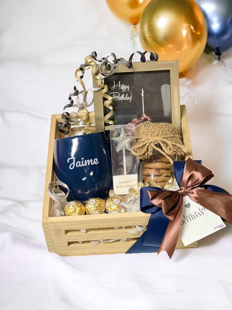 Cuadro Personalizado, Taza de cerámica ,3 Chocolate Ferrero, Snacks Bote de vidrio con galletas, Vela de Estrella. Base: caja de madera decorada, empaque termo fijado. Incluye tarjeta. Gratis Personalización: Cuadro y taza.