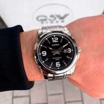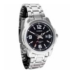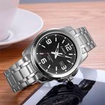 Reloj análogo color plata para caballero, correa de acero inoxidable, cristal mineral, presentación de fecha y hebilla de tres pliegues. Resistente al agua 50 metros.