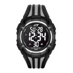 Reloj digital con correa plástica color negro con franjas en color gris para caballero. Características precisas y estilo deportivo vienen en el reloj Skechers El Porto, con una carcasa deportiva duradera, una correa de poliuretano y un cronómetro multifunción con una lectura digital. Este reloj cuenta con una caja de 1.811 in con una correa de 0.787 in de ancho. Carcasa redonda de policarbonato con una banda de poliuretano negro y gris. Resistente al agua hasta 164.0 ft: se puede llevar mientras nadas en aguas poco profundas