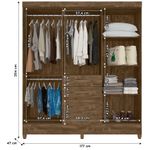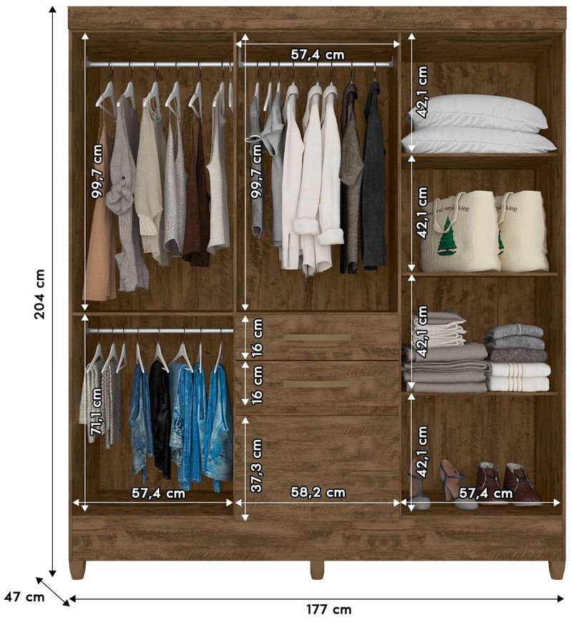 Dimensiones funcionales: Con medidas de 204 cm de alto, 177 cm de ancho y 47 cm de profundidad, es un ropero compacto pero muy completo, que se adapta perfectamente a espacios medianos y grandes.