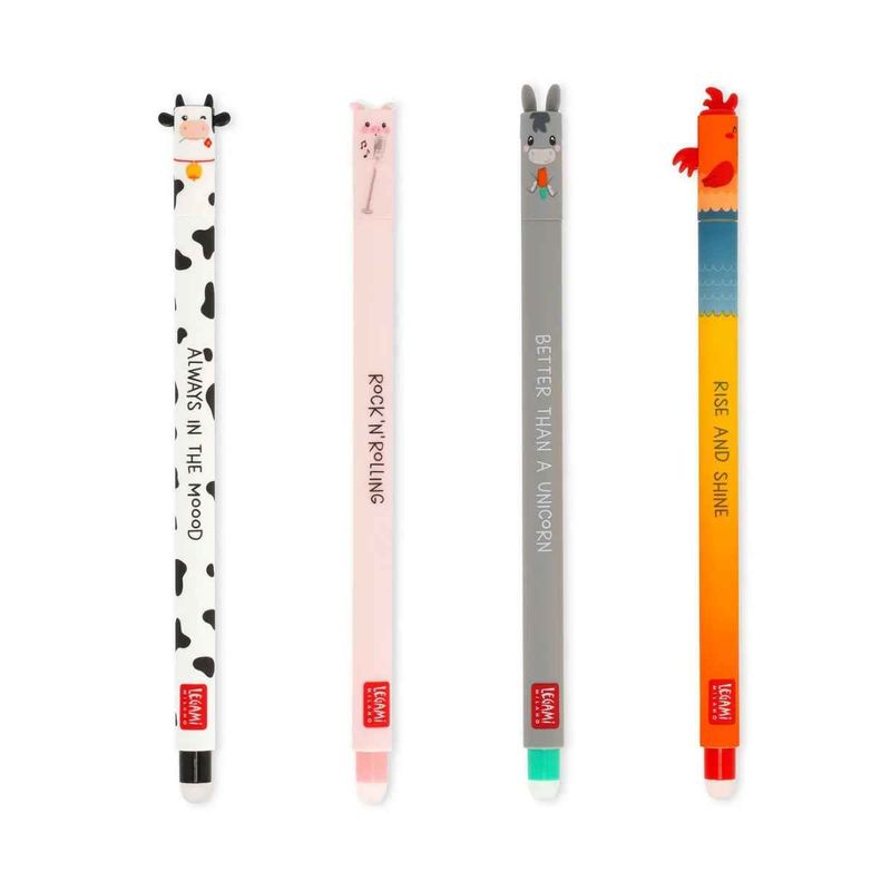 En la granja, ¡todos colaboran para que todo salga bien! Con el set de 4 bolígrafos de gel borrables "Farm Sweet Farm" de Legami, puedes llevarte a la escuela un corral lleno de animales en tu estuche, donde estarán listos para ayudarte si te equivocas: ¡solo frota la esfera de la punta sobre la tinta termosensible de color para borrarla y empezar de nuevo!