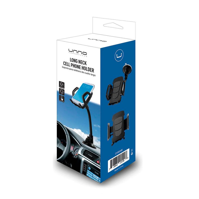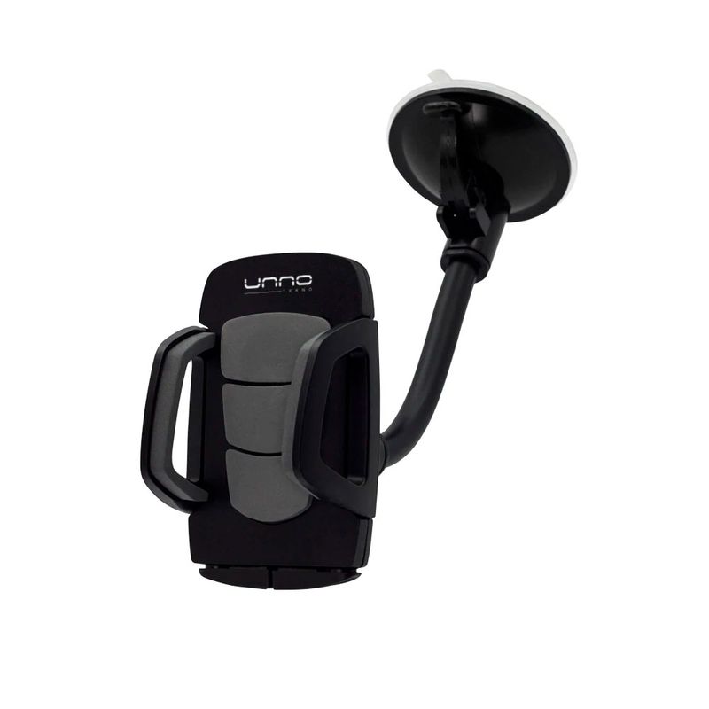 El Soporte para Móvil Unno Tekno CH3004BK es un accesorio de cuello largo con ventosa de gel, diseñado para sujetar tu teléfono de forma segura en el parabrisas o salpicadero del automóvil.