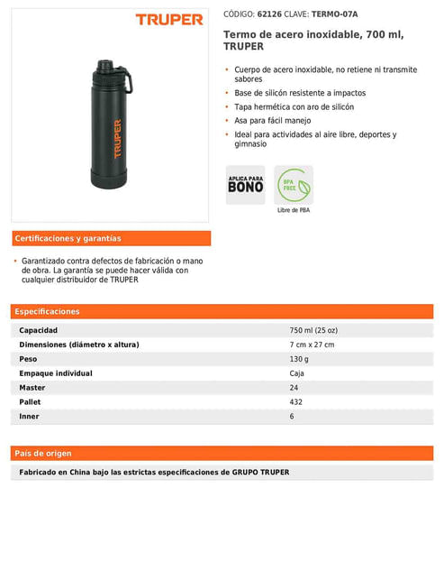 Termo fabricado en acero inoxidable que no retiene ni transmite sabores, ideal para uso diario o actividades al aire libre. Cuenta con base de silicón resistente a impactos, tapa hermética con aro de silicón y asa integrada para fácil manejo. Su diseño libre de PBA lo hace seguro y práctico para hidratarse en deportes o gimnasio.