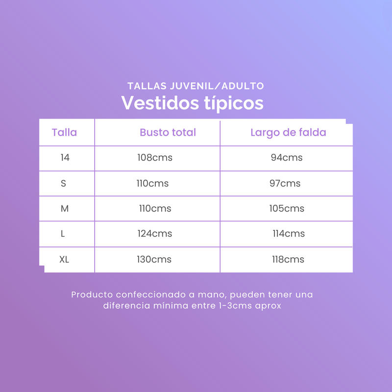 Grabado con el Escudo de El Salvador, ¡El vestido típico perfecto! Disponible en todas las tallas: Infantil, juvenil y de adulto. De manta súper fresquita, confeccionado a mano para cuidar cada pequeño detalle del vestido y asegurarte la mejor calidad.