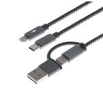 Práctico y versátil cable 5 en 1 para carga de múltiples dispositivos. Elaborado con aluminio y diseño de nylon trenzado, para mayor flexibilidad y durabilidad. Fácil de usar en el hogar, la oficina o mientras te trasladas. Entrada: USB Tipo A o C. Salida: Micro USB, Lightning (no reversible) o Tipo C.