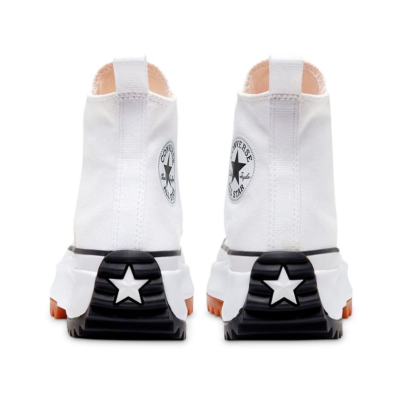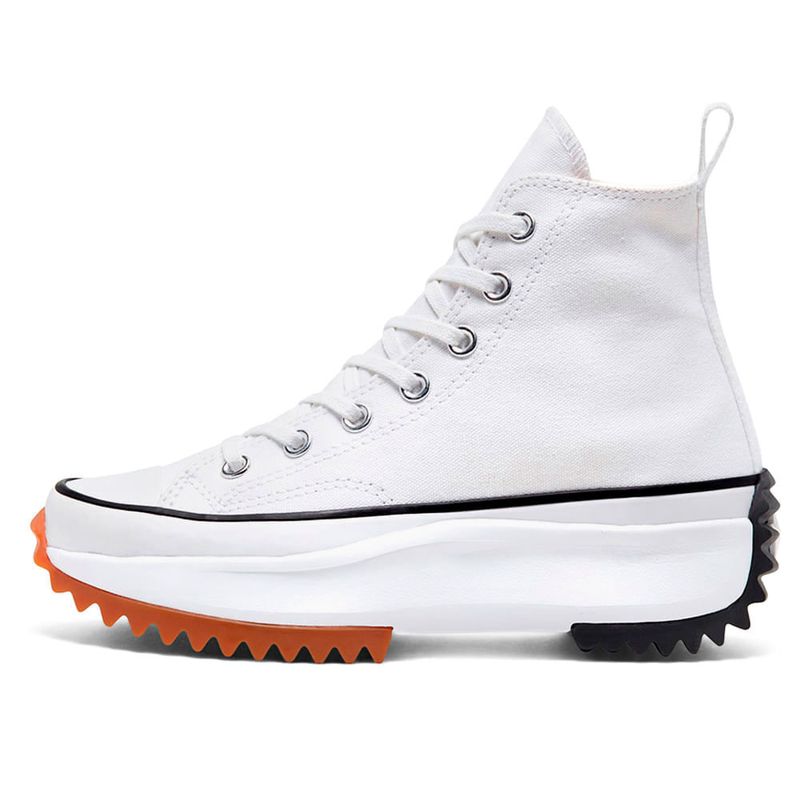 Zapato deportivo casual Converse Run star hike color blanco para dama. El clásico con una nueva apariencia. Una plataforma alta y una suela de goma dentada le dan a tus Chucks un giro inesperado. Esta edición lo mantiene limpio y clásico con lona de pergamino, rayas contrastantes y suela de goma. Zapatilla de lona de perfil alto con el clásico parche de estrella en el tobillo. Estilo icónico. La lengüeta con costura con aguja de mariposa brinda refuerzo. Plantilla OrthoLite da el confort. Suela con relieve y bloques de colores. OrthoLite es una marca de O2 Partners, LLC.